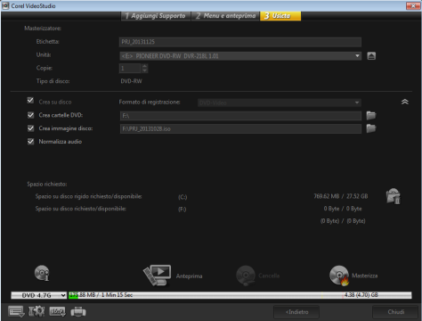 Questa è la fase finale nel processo di creazione del disco. È possibile masterizzare il filmato su un disco, salvarlo in una cartella su disco rigido oppure creare un file immagine disco per poter masterizzare il filmato in un secondo momento.