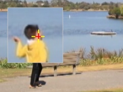 | Nell'esempio, l'indicatore viene trascinato sulla faccia del ragazzo. L'area viene ingrandita per offrire una visualizzazione più dettagliata della selezione. |