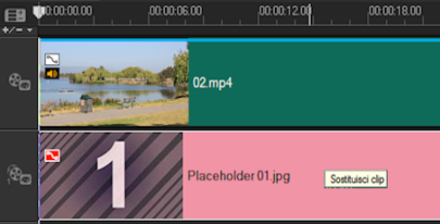 | 6 | Individuare il clip multimediale desiderato dalla Libreria e trascinarlo sul segnaposto sulla linea temporale. Durante il trascinamento, premere [Ctrl] per bloccare il nuovo clip multimediale nella posizione del segnaposto e sostituire il clip. |