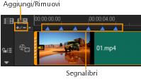 Un segnalibro può essere aggiunto anche trascinando il dispositivo di scorrimento della linea temporale nella posizione desiderata all'interno del progetto e facendo clic su Aggiungi/Rimuovi segnalibro.
