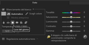Temperatura: consente di specificare la temperatura di colore delle sorgenti luminose in Kelvin (K). I valori bassi indicano scenari di tipo Tungsteno, Fluorescente e Luce del giorno, mentre gli scenari Nuvola, Ombra e Nuvoloso rientrano tra le temperature di colore elevate. |