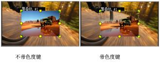 色度键 — 用于从覆叠素材中删除指定颜色。例如,如果您在"绿色屏幕"背景中捕获主题,或者以绿色覆盖部分主题,可使用"色度键"删除绿色。然后,您可以将主题放置在另一个背景中,以更改环境或创建特殊效果,如出现悬停对象。 |