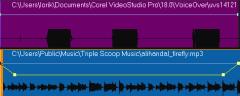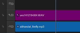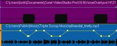 在这些示例中,旁白是紫色轨,音乐是蓝色轨。每个示例中的黄线表示,通过为音频闪避应用不同敏感度设置:顶部 = 0,中间 = 2 和底部 = 30,音乐轨音量何时降低以及降低幅度。在本例中,设置为 2 效果最佳。
